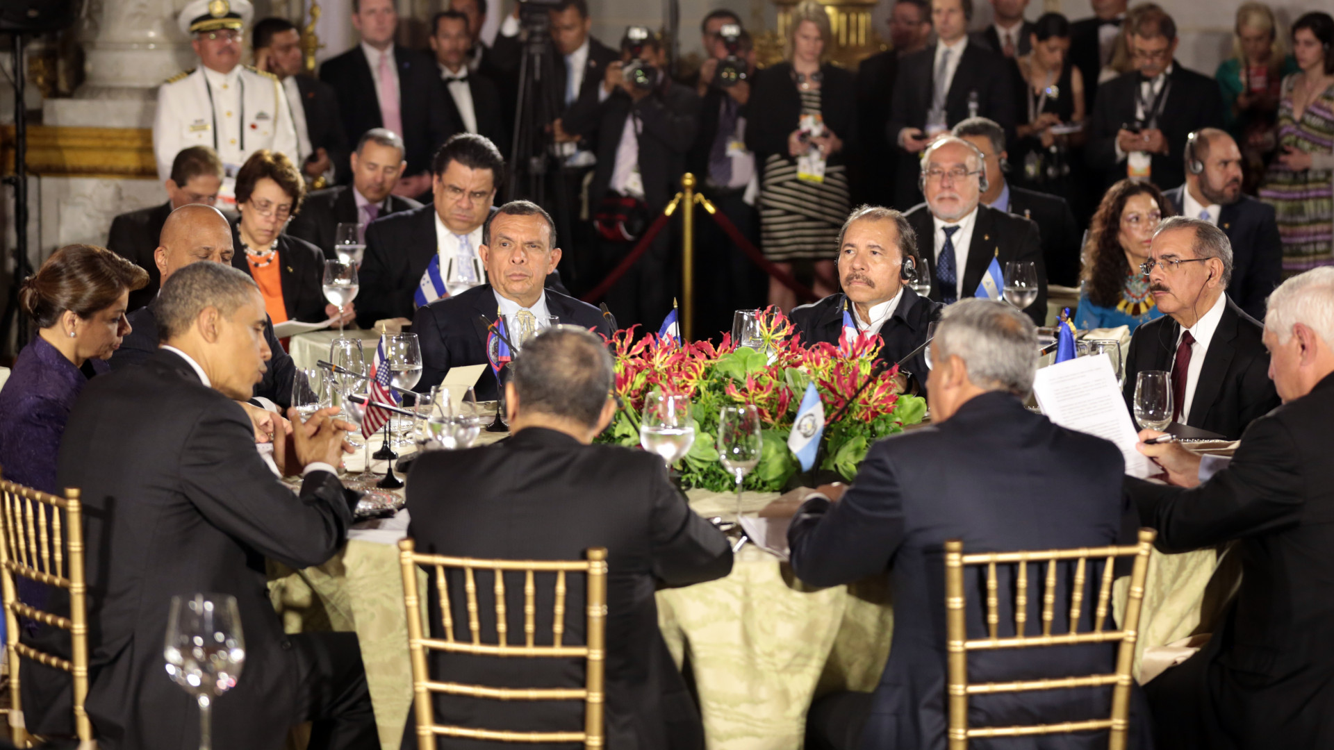 El presidente Medina (de frente a la derecha) participa, junto a los demás mandatarios, en la sesión plenaria de la reunión especial del Sistema de la Integración Centroamericana y de Estados Unidos (SICA-EEUU) celebrada ayer en San José, Costa Rica. presidencia.gob.do/comunicados/danilo-medina-cree-la-inte...