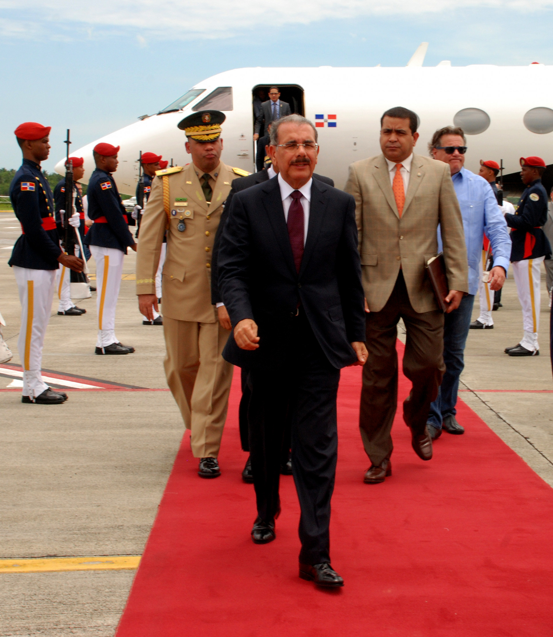 El presidente de la República, Danilo Medina, camina hacia la terminal aérea Joaquín Balaguer, luego de abandonar el avión en el cual regresó desde San José, Costa Rica, donde participó en la Cumbre del Sistema de la Integración Centroamericana (SICA).http://presidencia.gob.do/comunicados/al-llegar-desde-costa-rica-presidente-medina-dice-esperar-ratificaci%C3%B3n-de-petrocaribe