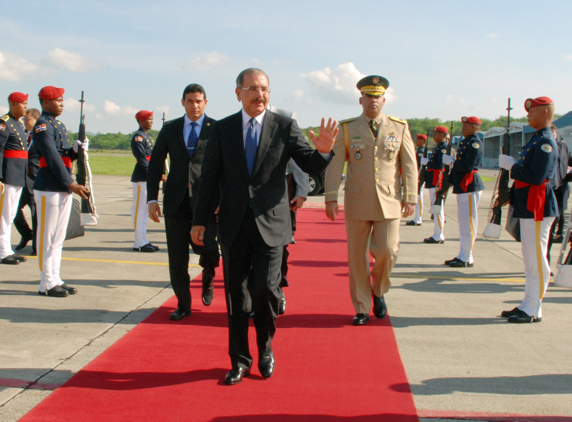 El presidente de la República, Danilo Medina, saluda mientras camina, en el aeropuerto internacional Joaquín Balaguer. hacia el avión en el cual irá a Caracas, capital de la República Bolivariana de Venezuela, donde participará en la VII Cumbre de Jefes de Estado y de Gobierno que integran el acuerdo Petrocaribe.