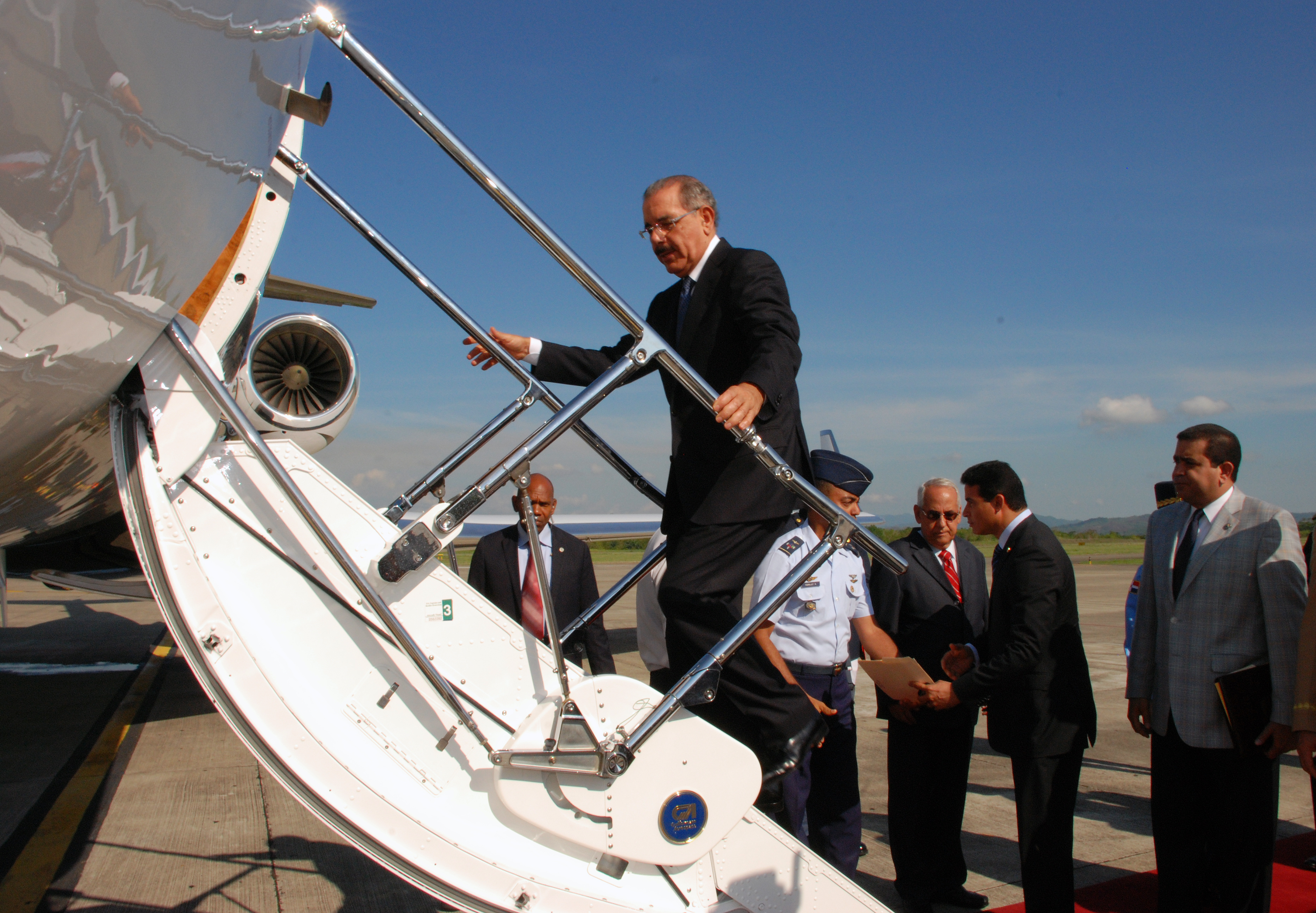 El presidente de la República, Danilo Medina, aborda el avión, en el cual partirá hacia Caracas, República Bolivariana de Venezuela, donde participará en la VII Cumbre de Jefes de Estado y de Gobierno que integran el acuerdo Petrocaribe.