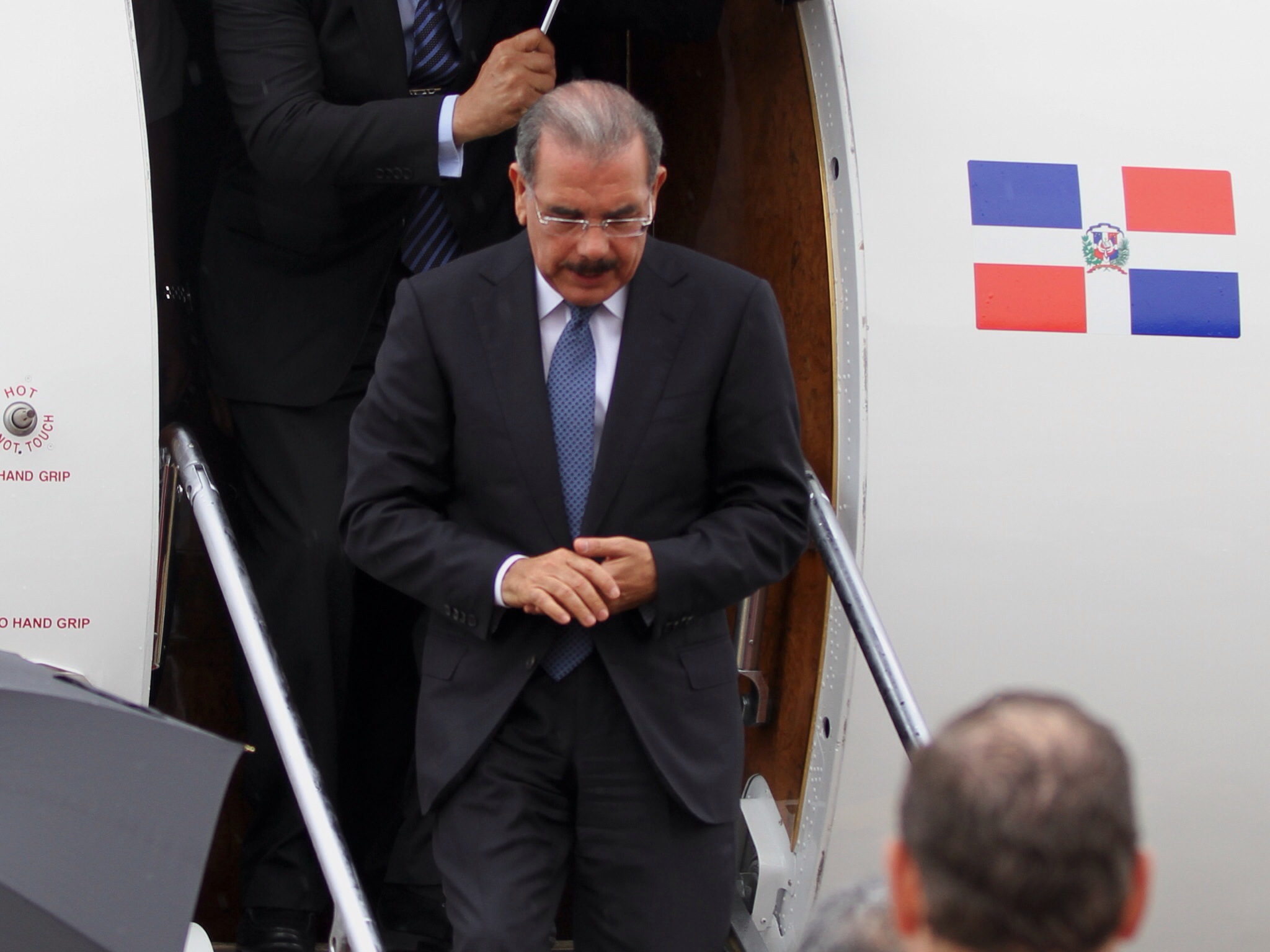 El presidente de la República, Danilo Medina, sale del avión, en el aeropuerto de Maiquetía, en Carcas, capital de la República Bolivariana de Venezuela, donde participará en la VII Cumbre de Jefes de Estado y de Gobierno que integran el acuerdo Petrocaribe.
