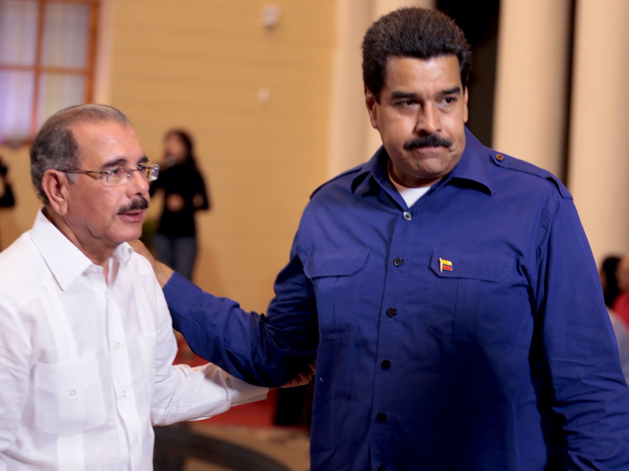 El presidente de la República, Danilo Medina, y el presidente de la República Bolivariana de Venezuela, Nicolás Maduro, se tocan hombros y brazos luego de concluir la VII Cumbre de Jefes de Estado y de Gobierno de Petrocaribe.