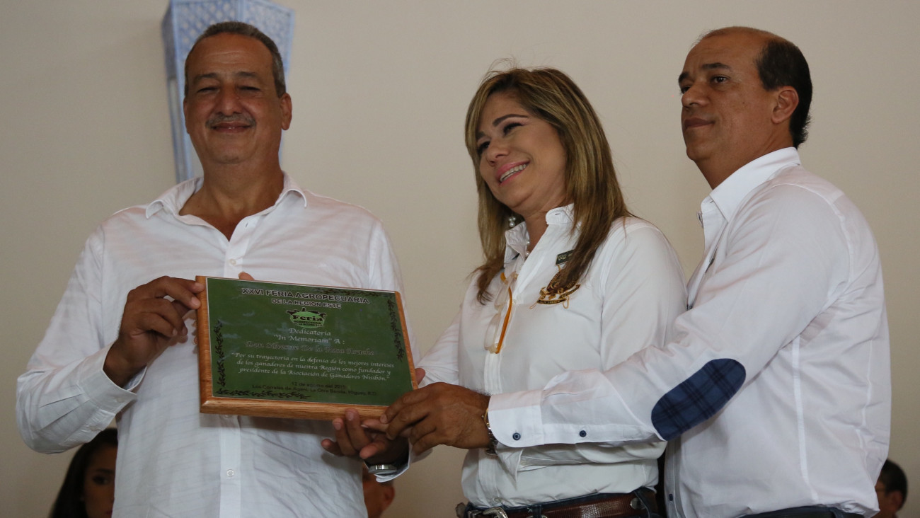 Durante el acto de apertura de la Feria Agropecuaria del Este, también se dedicó un reconocimiento, in memoriam, a don Silvestre De la Rosa Arache. Fausto De la Rosa recibe la placa en nombre de la familia.