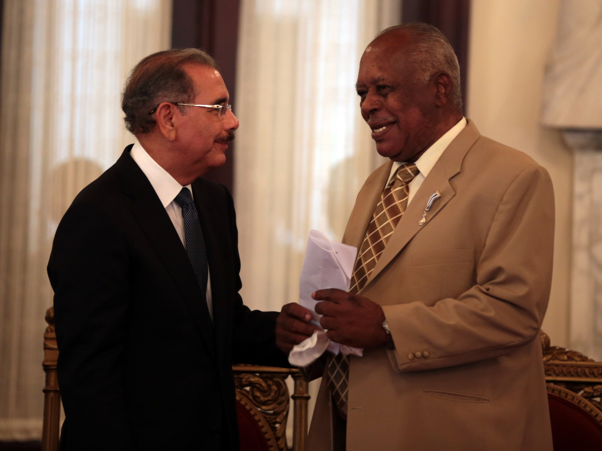 El presidente Danilo Medina comparte con el periodista Emilio Herasme Peña, ganador del Premio Nacional de Periodismo 2013, durante un acto celebrado en el Salón Las Cariátides del Palacio Nacional.