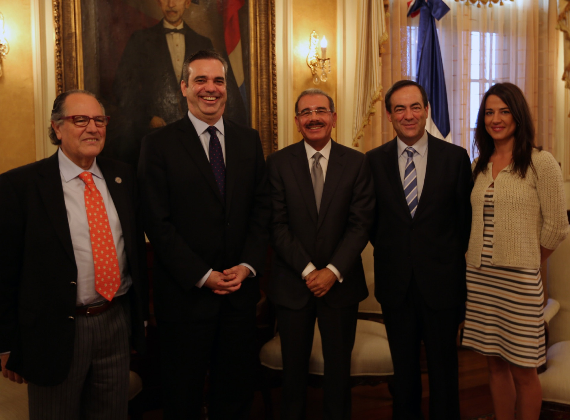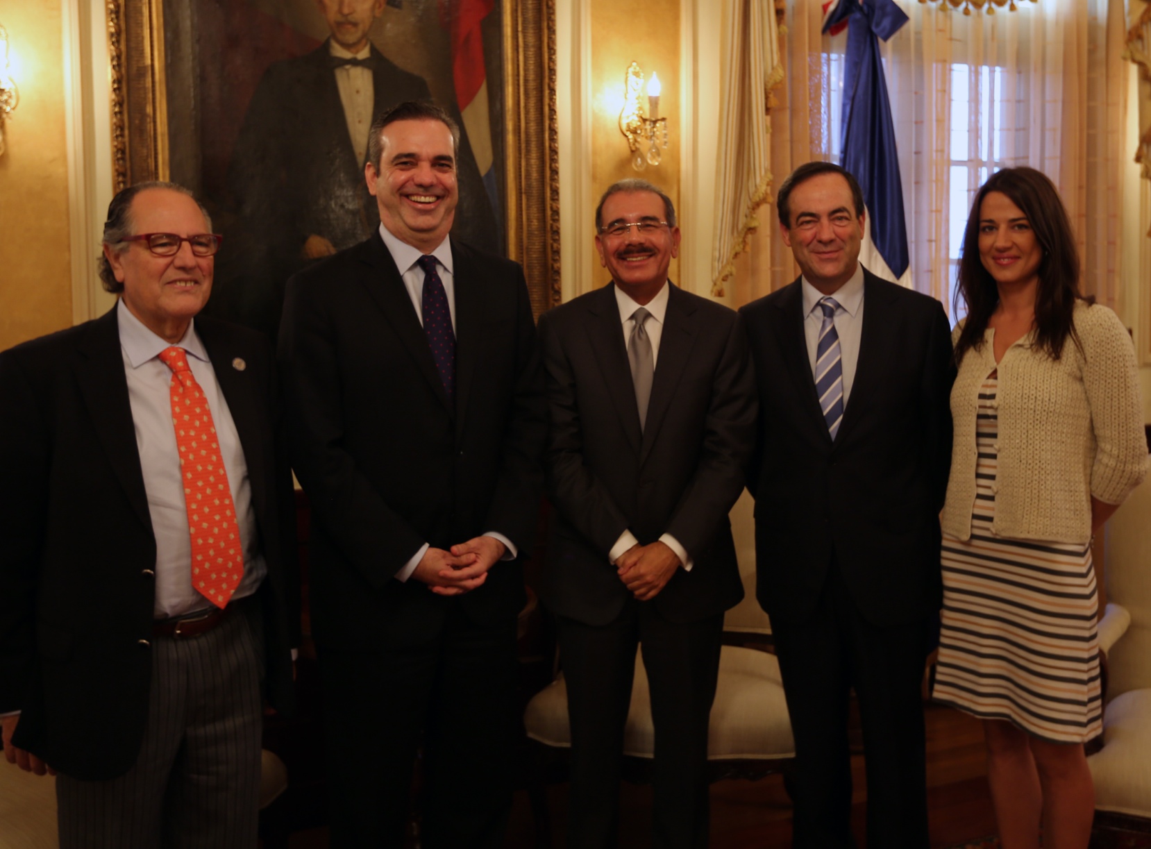 El presidente de la República, Danilo Medina junto a Luis Abinader, ex candidato vicepresidencial del PRD; el escritor y político español, José Bono; el consultor social Manuel Domínguez y la señorita Ana Bono, hija del escritor.