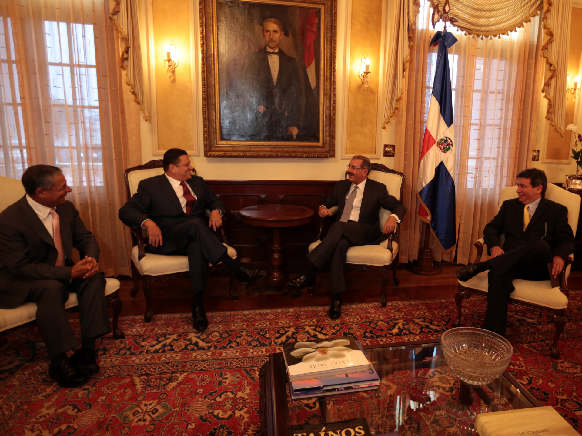 El presidente de la República, Danilo Medina, (a la derecha de la Bandera Nacional) recibe, en su despacho del Palacio Nacional, la visita del alcalde de San José, capital de Costa Rica, Johnny Araya Monge, quien además es candidato presidencial de Costa Rica, por el Partido Liberación Nacional (PLN). Acompañan a Araya el alcalde del Distrito Nacional, Roberto Salcedo y Fernando Berrocal Soto, ex ministro de la Presidencia de Costa Rica.