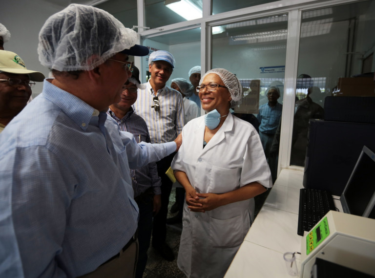 El presidente de la República, Danilo Medina, saluda a una empleadas del proyecto ganadero D-1 Ysura, Azua, donde además funciona una pasteurizadora, durante un recorrido por las instalaciones de esa procesadora.