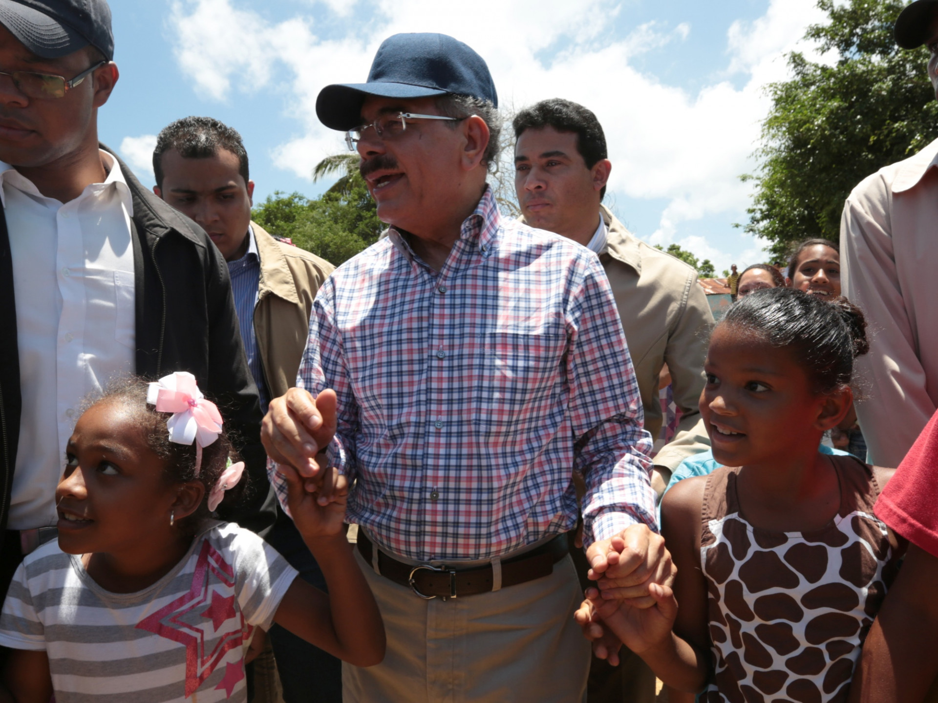 El presidente de la República, Danilo Medina, camina junto dos niñas de la comunidad,quienes en medio de la multitud se abrieron espacio para saludarlo a su llegada a Baoba del Piñal, Nagua. El Mandatario se reunió con productores de arroz y pescadores de la zona, para escuchar sobre las dificultades que impiden incrementar la producción y ofrecerles la ayuda del Gobierno.