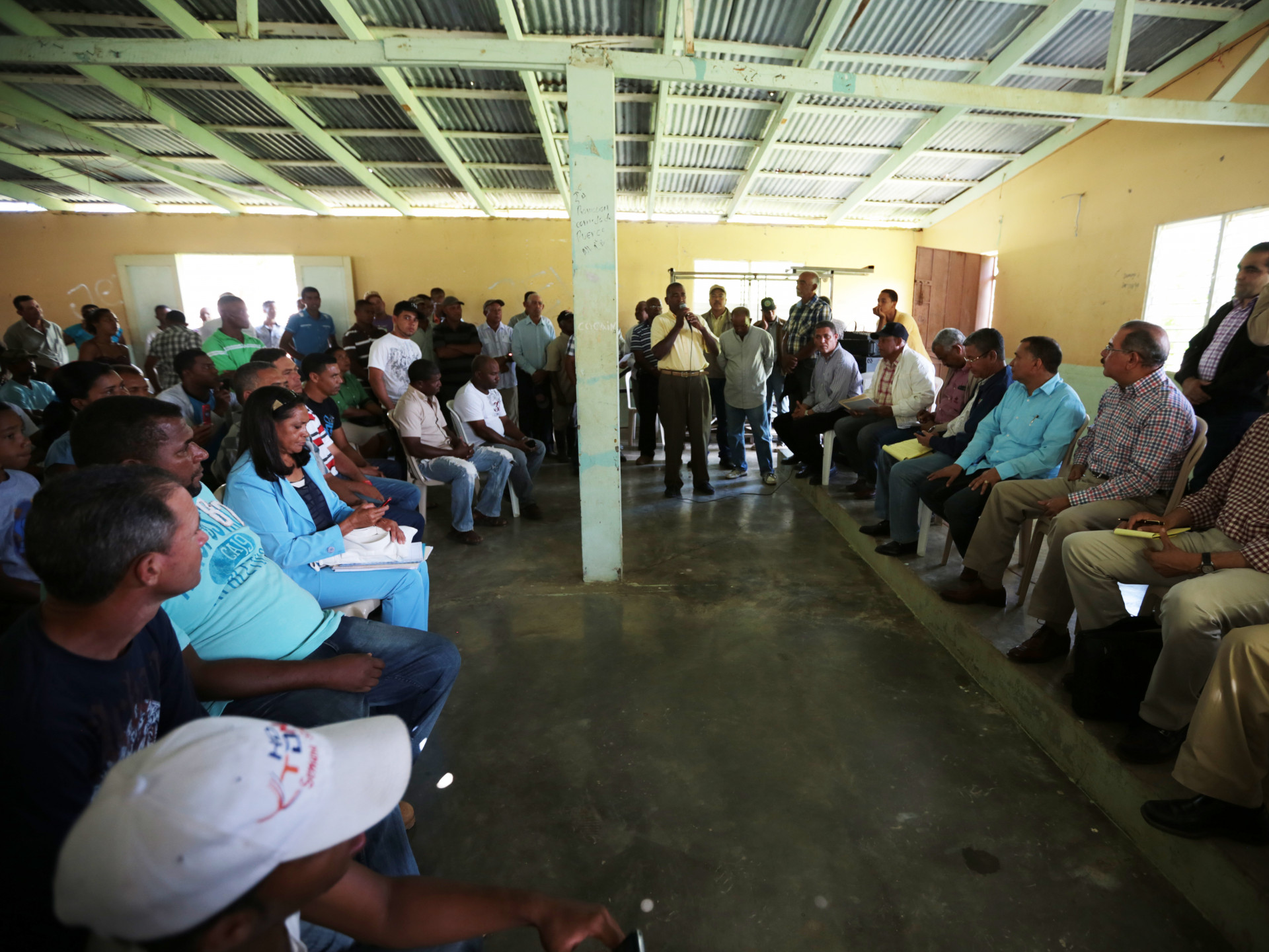 El presidente de la República, Danilo Medina, (primero desde la derecha, sentado, con camisa de cuadros rojos y azules) escucha a uno de los productores arroceros de Baoba del Piñal, provincia María Trinidad Sánchez, donde llegó de forma sorpresiva a escuchar de sus planes y necesidades para luego brindarles ayuda.