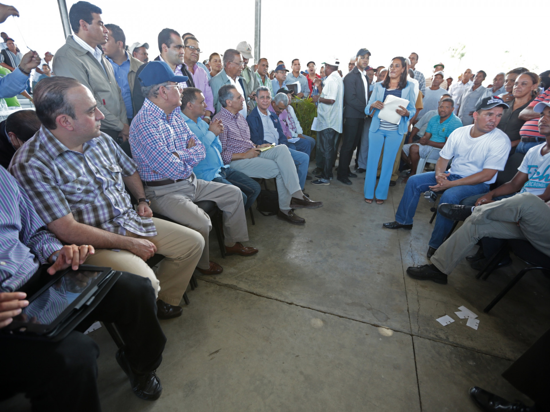 El presidente de la República, Danilo Medina (tercero de izquierda a derecha), escucha una dama de la comunidad Baoba del Piñal, de Nagua, donde el Mandatario llegó de sorpresa para saber de primera mano, sobre las dificultades de los pescadores y los productores de arroz, de esa población.