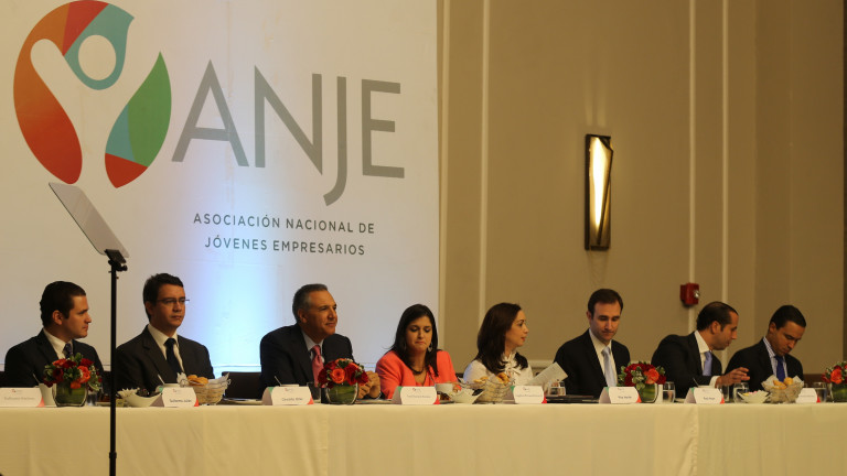 Mesa principal encabezada por el Lic. José Ramón Peralta, ministro administrativo de la Presidencia; la Lic. Biviana Riveiro Disla, presidenta de la Asociación Nacional de Jóvenes Empresarios (ANJE), y principales miembros de la junta directiva de la institución, presentes en la actividad.
