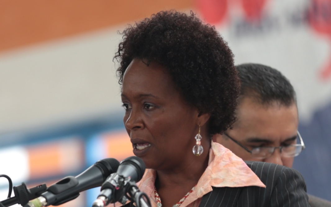 Margarita García, una de las productoras de chocolate de la Cuenca de Altamira (Chocal), Puerto Plata, se dirige a los presentes en el acto que encabeza el presidente de la República, Danilo Medina, en Moca en celebración por el Día Nacional del Agricultor.