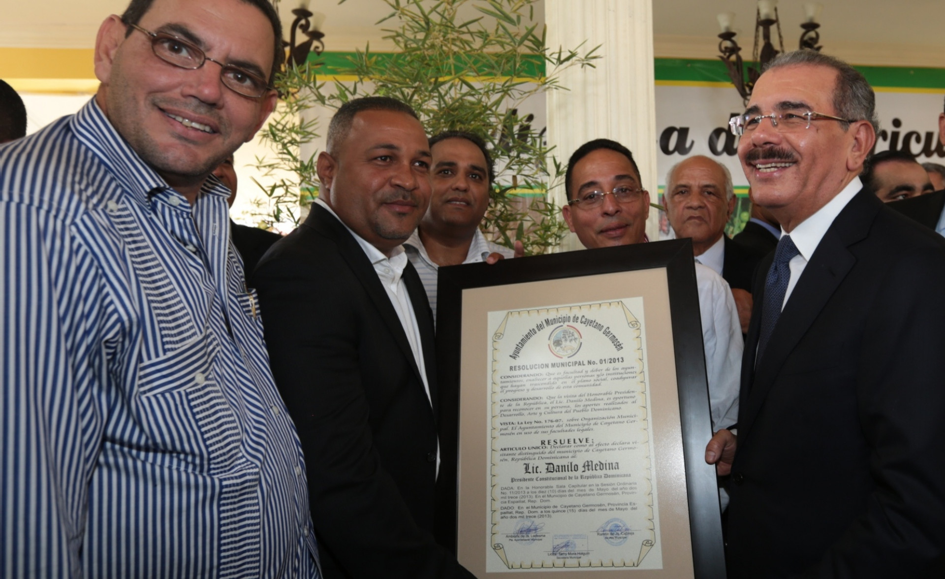 Representantes del ayuntamiento municipal de Cayetano Germosén, al momento de entregar el pergamino que declara como Visitante Distinguido al Lic. Danilo Medina, presidente de la República, durante uno de los actos efectuados el Día del Agricultor, donde luego asistió a un almuerzo y compartió con los asistentes.