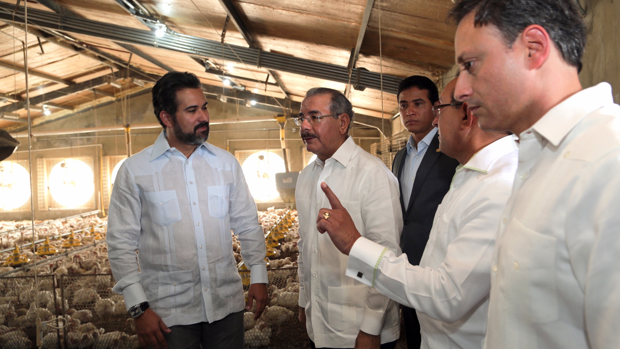 Presidente Danilo Medina junto a funcionarios del gobierno y ejecutivos de Pollo Cibao, presentes durante recorrido por las instalaciones de la empresa.