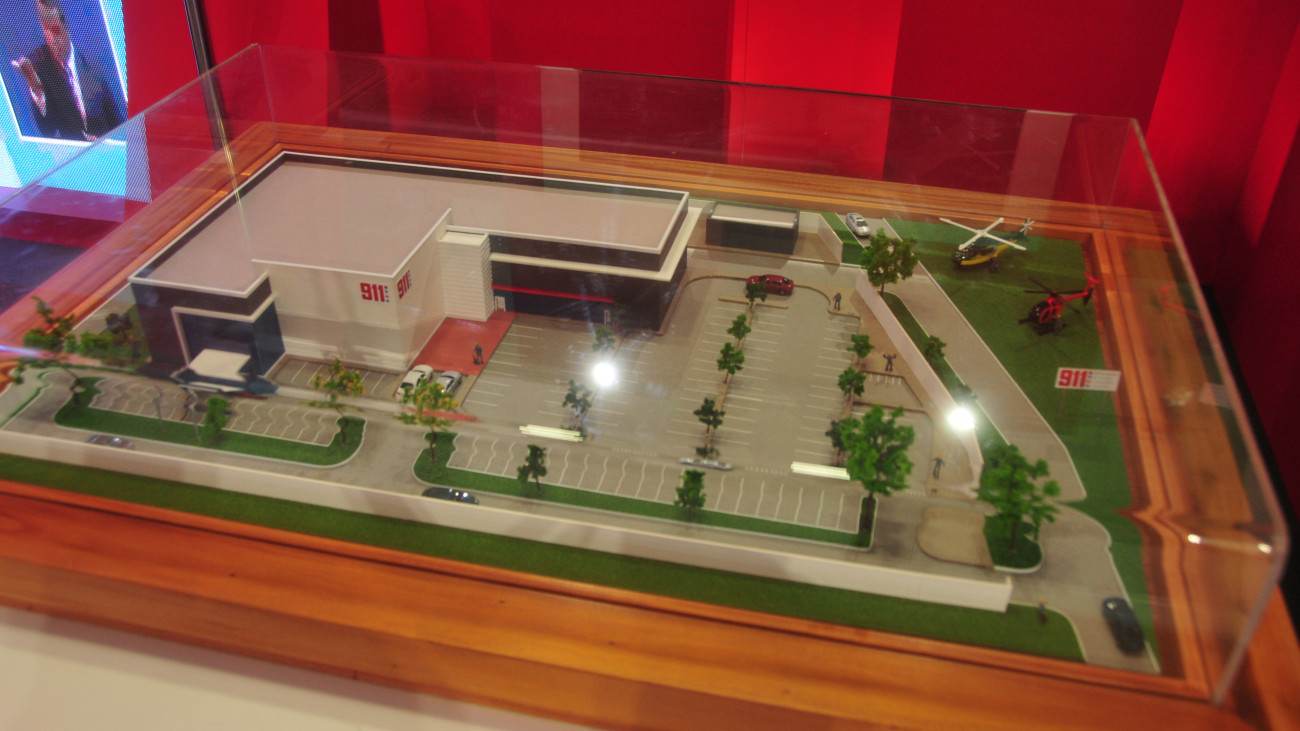 Maqueta de las instalaciones del Sistema Nacional de Atención a Emergencias y Seguridad 911, expuesto en la Expo Cibao 2015, que se celebra en Santiago de los Caballeros.