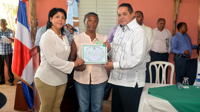 Acto de entrega de títulos provisionales, encabezado por el director general del IAD, Emilio Toribio Olivo, para un total de 85 familias de la comunidad El Duey, en Cotuí, realizado como parte del programa de titulaciones de terrenos del Estado, dispuesto por el Presidente Danilo Medina.