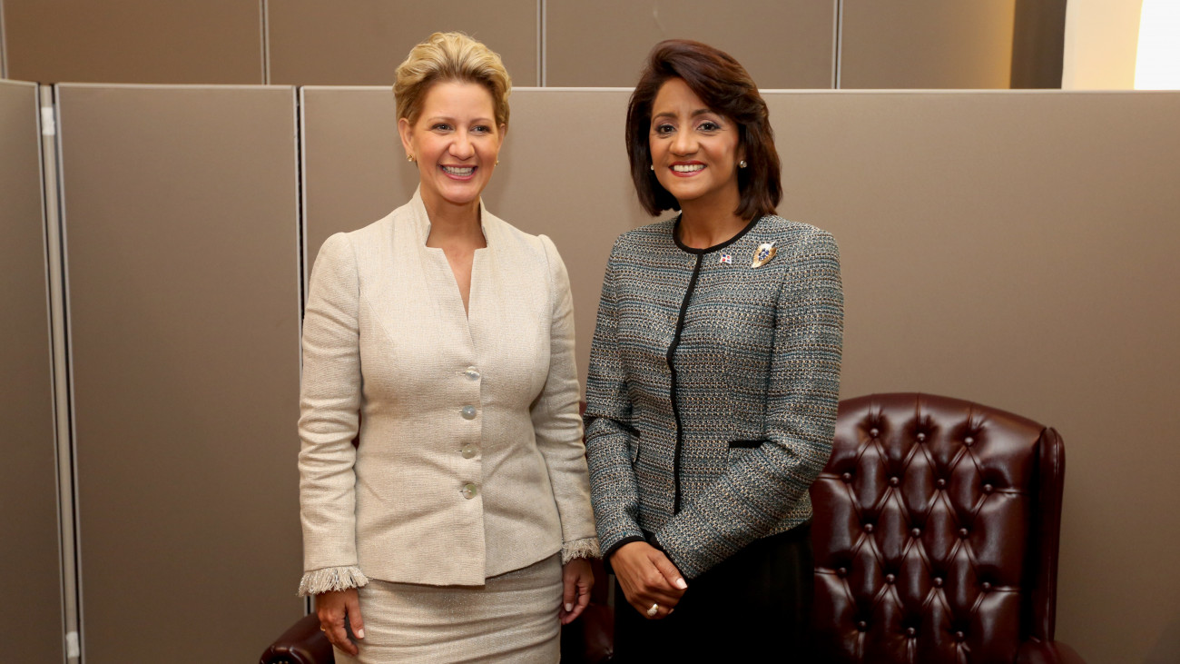 Señora Cándida Montilla de Medina y su homóloga de Panamá, Lorena Castillo de Valera, durante encuentro bilateral celebrado en la sede principal de ONU.