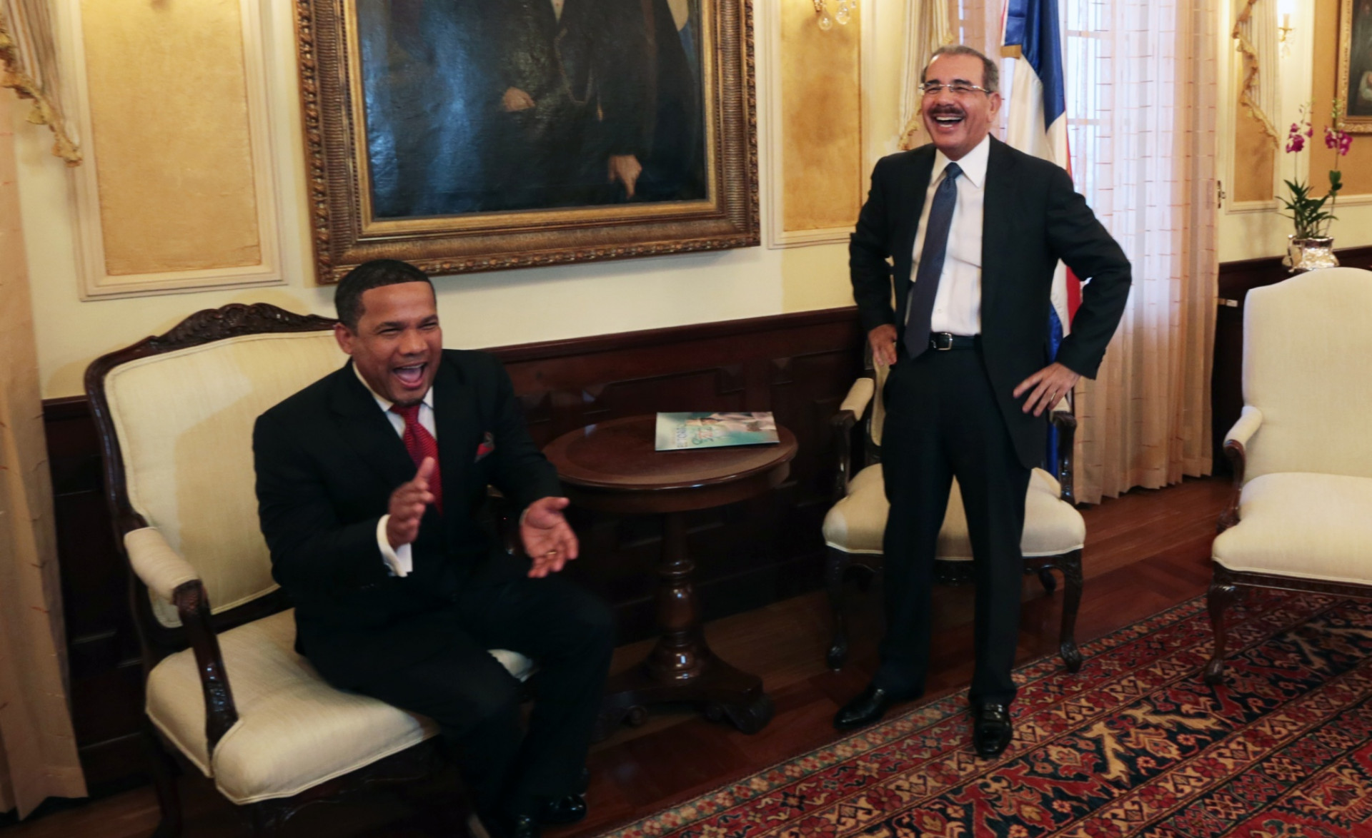 El mandatario Danilo Medina y el cantante Héctor Acosta sonríen en el despacho presidencial.