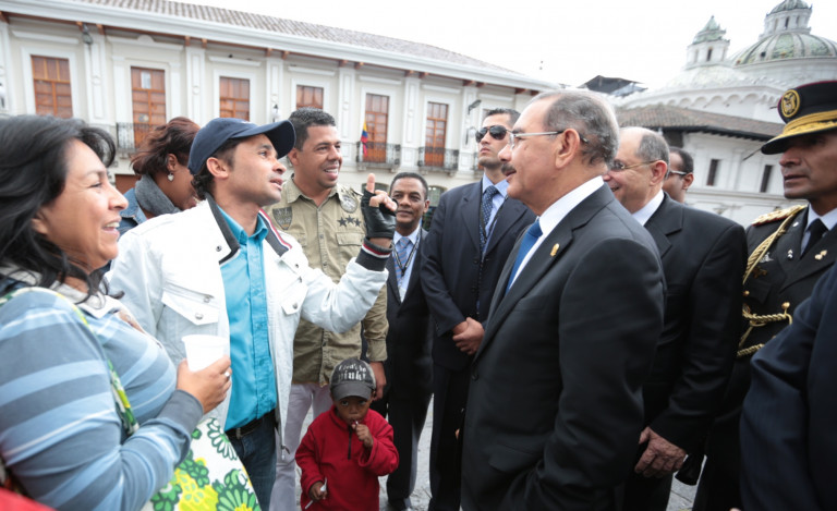 El presidente Danilo Medina conversó de manera cordial con diferentes ciudadanos en el Centro Histórico de la capital ecuatoriana, luego de participar junto a su comitiva en los actos oficiales de juramentación del reelecto presidente de Ecuador, Rafael Correa.