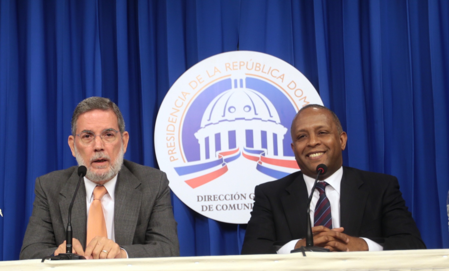 El director general de Comunicación de la Presidencia, Roberto Rodríguez Marchena, presenta al contralor de la República, Rafael Germosén Andújar, durante el Encuentro Semanal con los Medios que realiza cada lunes la Dirección General de Comunicación (DICOM), en el Palacio Nacional.