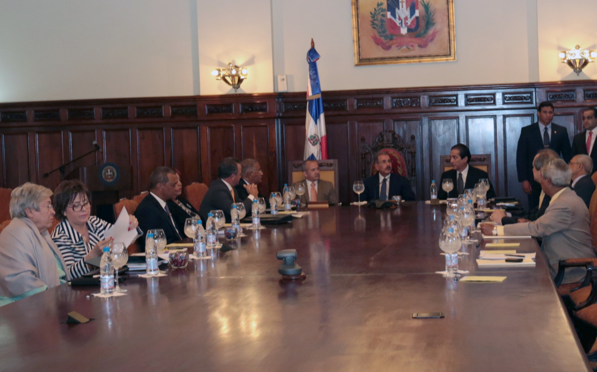 El presidente Danilo Medina encabeza la reunión con los miembros de la Comisión de la Seguridad Social, en el Palacio Nacional, con quienes analiza la situación actual de ese sector en sus tres componentes: Seguro Familiar de Salud, Seguro de Pensiones y Seguro de Riesgos Laborales.