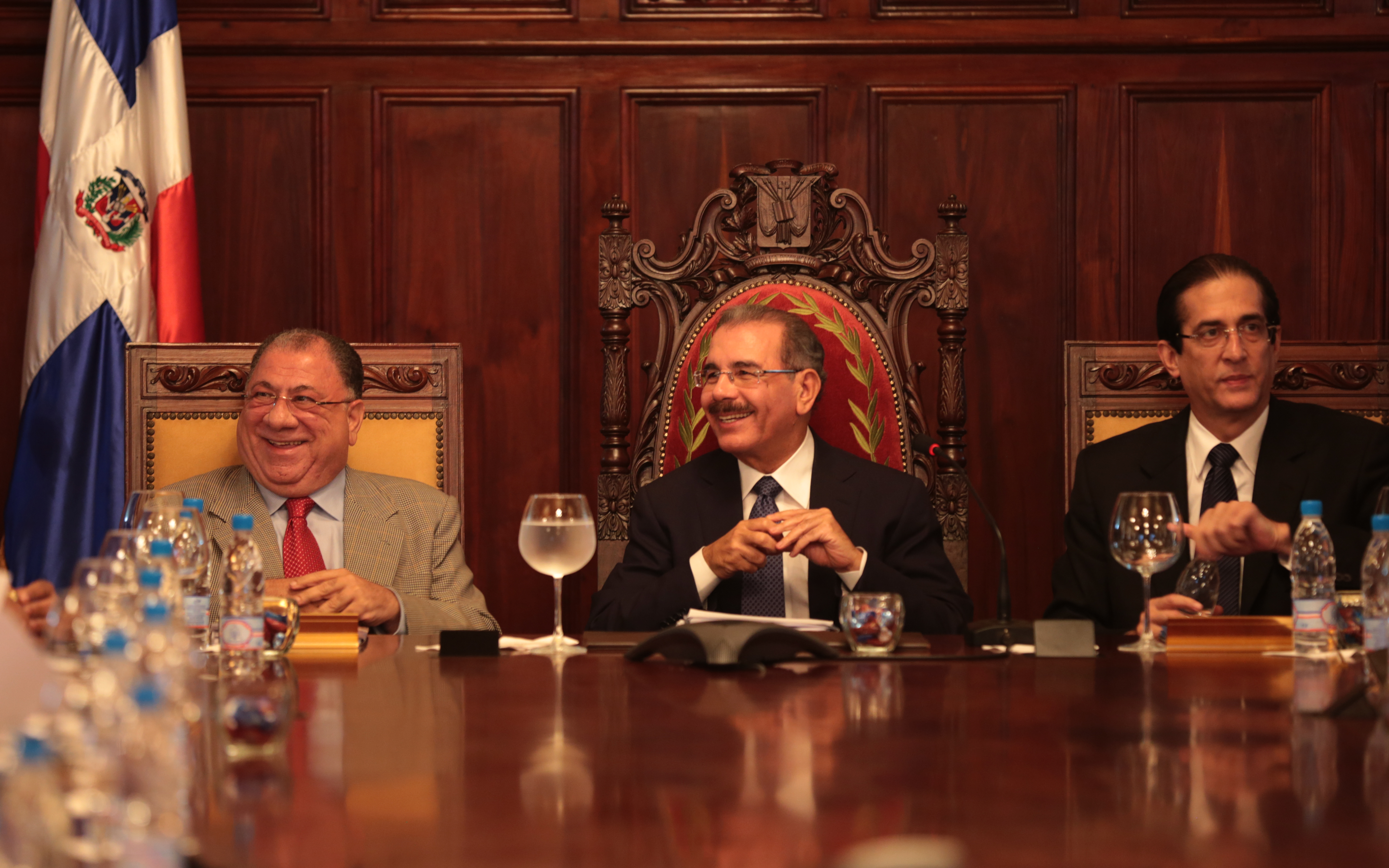 El presidente Danilo Medina (centro) y los ministros de la Presidencia, Gustavo Montalvo (derecha); y de Interior y Policía, José Ramón Fadul, durante la reunión con los responsables de las instituciones gubernamentales que integran el “Programa Vivir Tranquilo”.