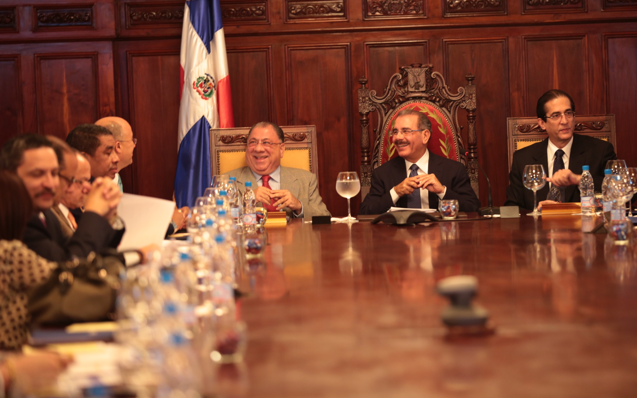 El presidente Danilo Medina (centro) y los ministros de la Presidencia, Gustavo Montalvo (derecha); y de Interior y Policía, José Ramón Fadul, durante la reunión, en el Palacio Nacional, con los responsables de las instituciones gubernamentales que integran el “Programa Vivir Tranquilo”.