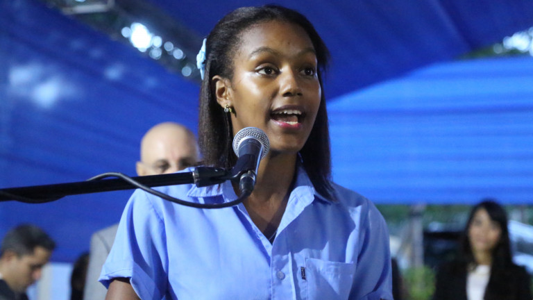 La estudiante de cuarto grado de media, Dislayni Guadalupe Ulerio, al dar las gracias, definió al presidente Danilo Medina como un titán y padre de la educación dominicana, pues se atrevió a cumplir con la entrega del 4% del Producto Interno Bruto a ese sector.
