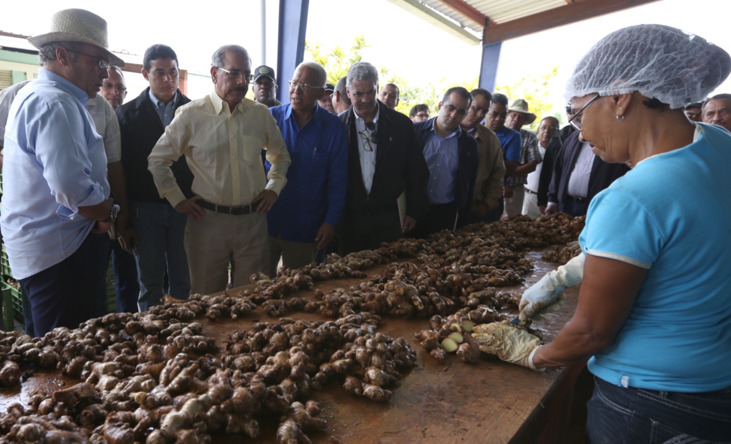 El presidente Danilo Medina observa el procedimiento de corte de jengibre durante su visita a Monte Plata, donde se reunió con más de 70 asociaciones y cooperativas, y aprobó créditos para su desarrollo.