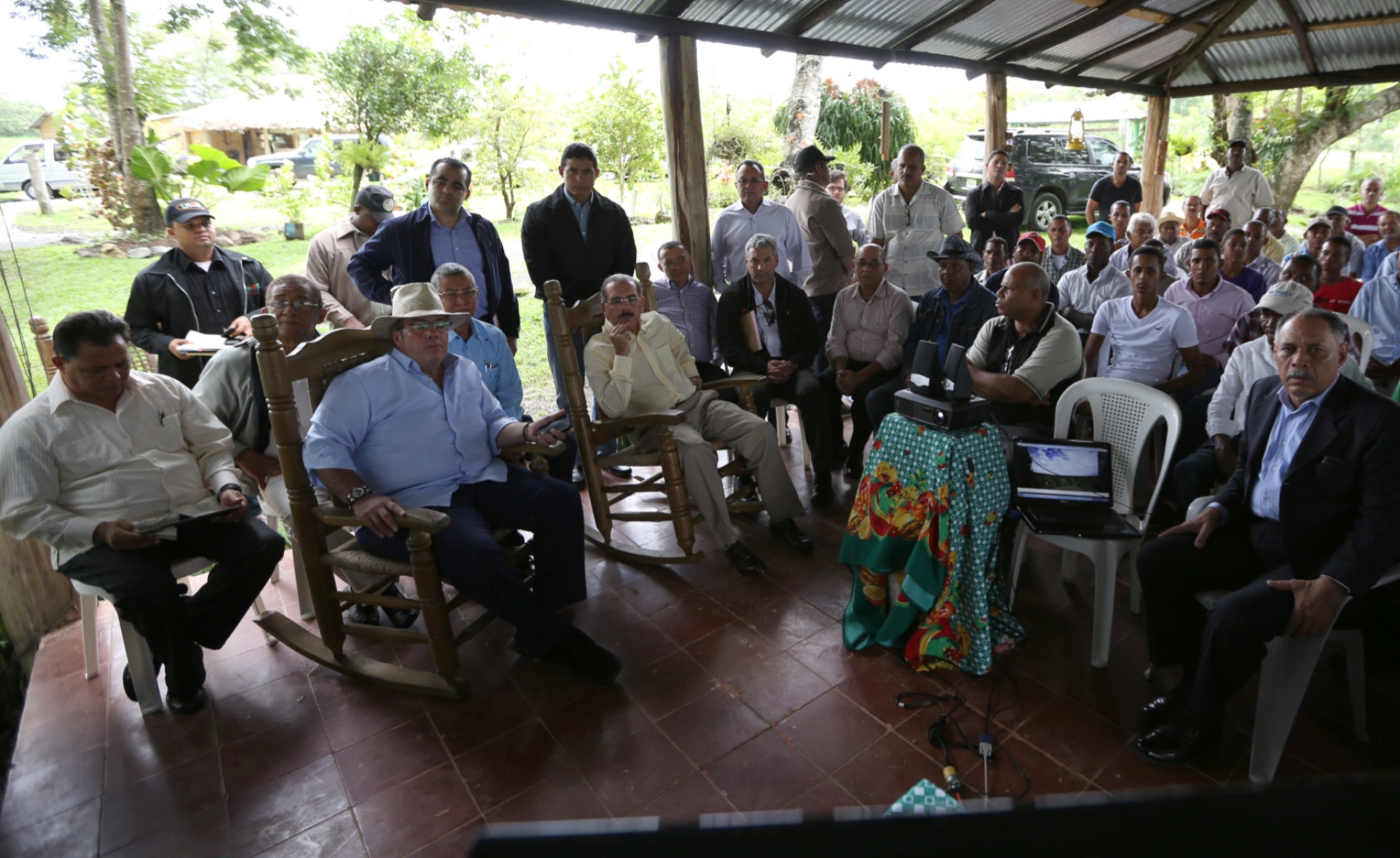 El presidente Danilo Medina escucha con atención las explicaciones de los productores de miel de Monte Plata, donde aprobó créditos por unos 30 millones de pesos a baja tasa de interés que beneficiarán también a productores de piña y lima persa.