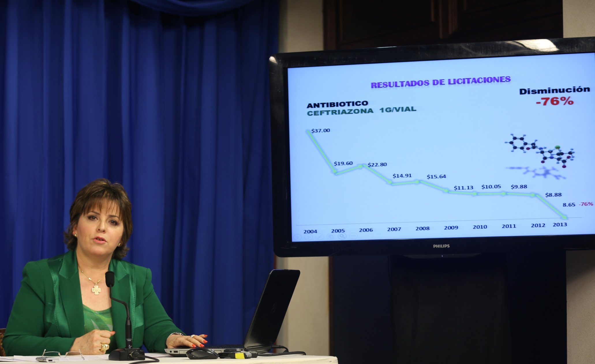 Elena Fernández Núñez, directora del Programa de Medicamentos Esenciales/Central de Apoyo Logístico (PROMESE/CAL), presenta las estadísticas a los periodistas durante el Encuentro con los Medios, en el Palacio Nacional, que realiza la Dirección General de Comunicación (DICOM), donde destacó los beneficios de la aplicación del decreto 608-12.