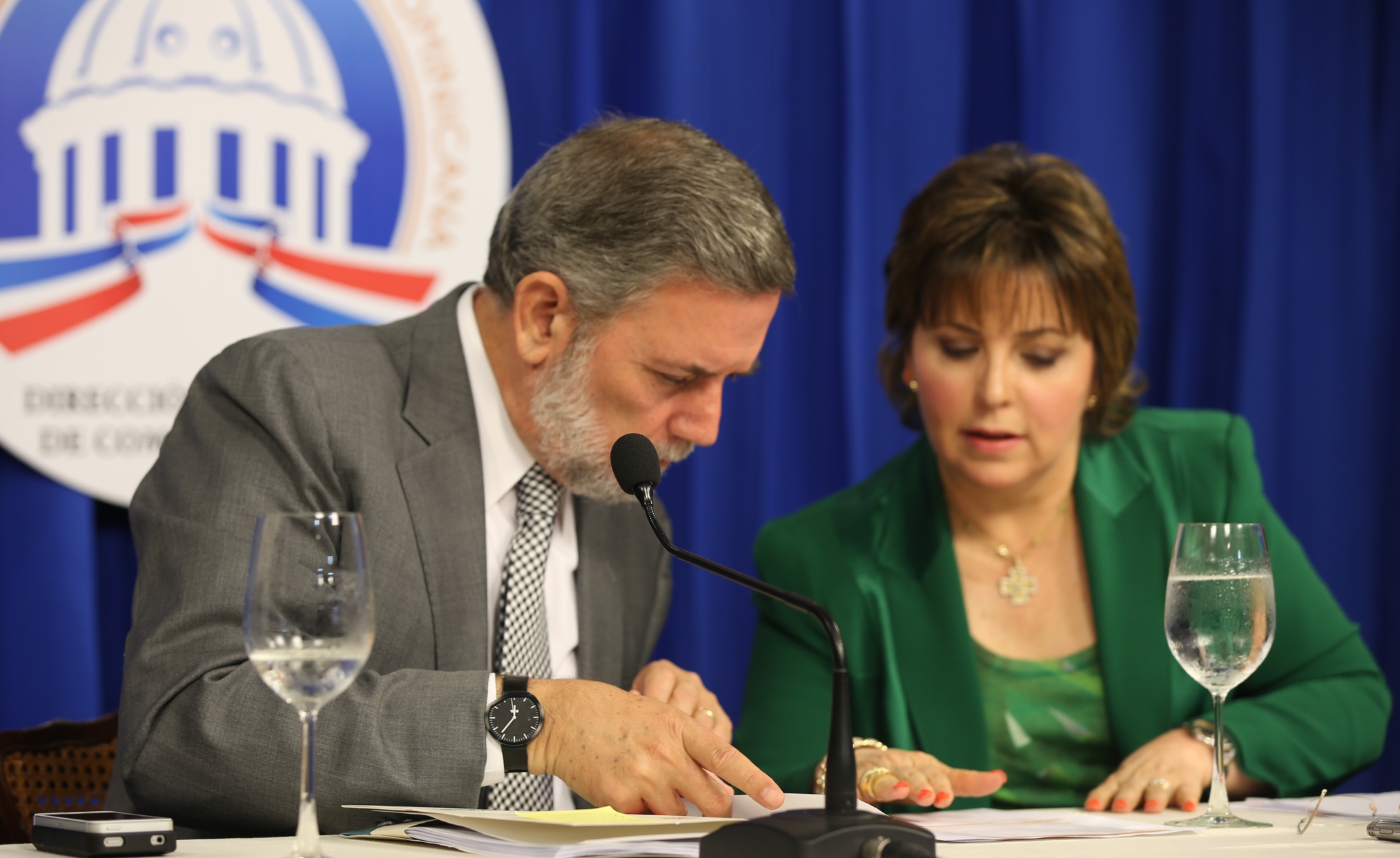 La directora del Programa de Medicamentos Esenciales/Central de Apoyo Logístico (PROMESE/CAL), Elena Fernández Núñez, comparte algunas estadísticas con el director general de Comunicación de la Presidencia, Roberto Rodríguez Marchena, durante su participación en el Encuentro con los Medios, en el Palacio Nacional.