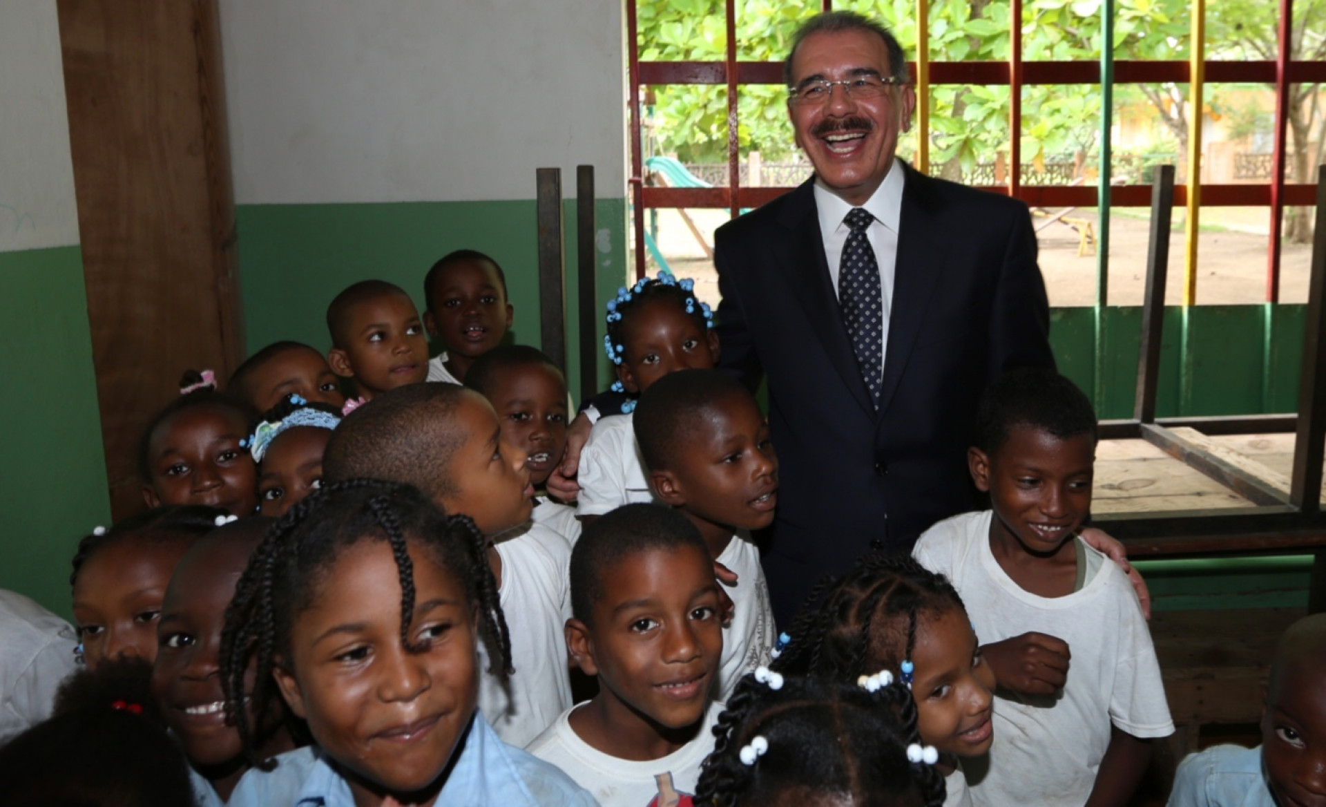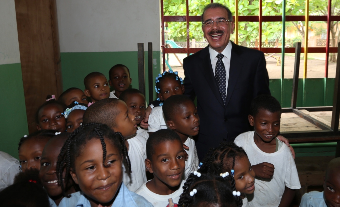 El presidente Danilo Medina comparte lleno de entusiasmo con los niños del Programa Comunitario de Educación Integral “Futuro Vivo”, durante la visita sorpresa que realizó a este centro escolar, que coordinan las Hermanas Carmelitas, en el municipio de Guerra, provincia Santo Domingo.