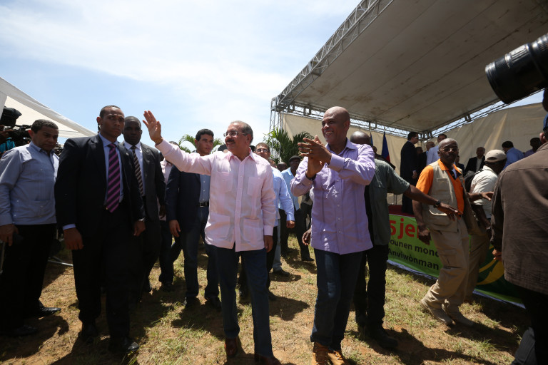 El presidente de la República, Danilo Medina, camina junto a presidente de Haiti, Michel Martelly, y saludan moradores de la zona al llegar a esta nación vecina, para participar en las actividades programadas por el Día Mundial del Medio Ambiente. Los dos mandatarios recibieron los saludos del embajador dominicano en Haití, José Silié, y de Fritz Cineas, embajador de Haití en República Dominicana.