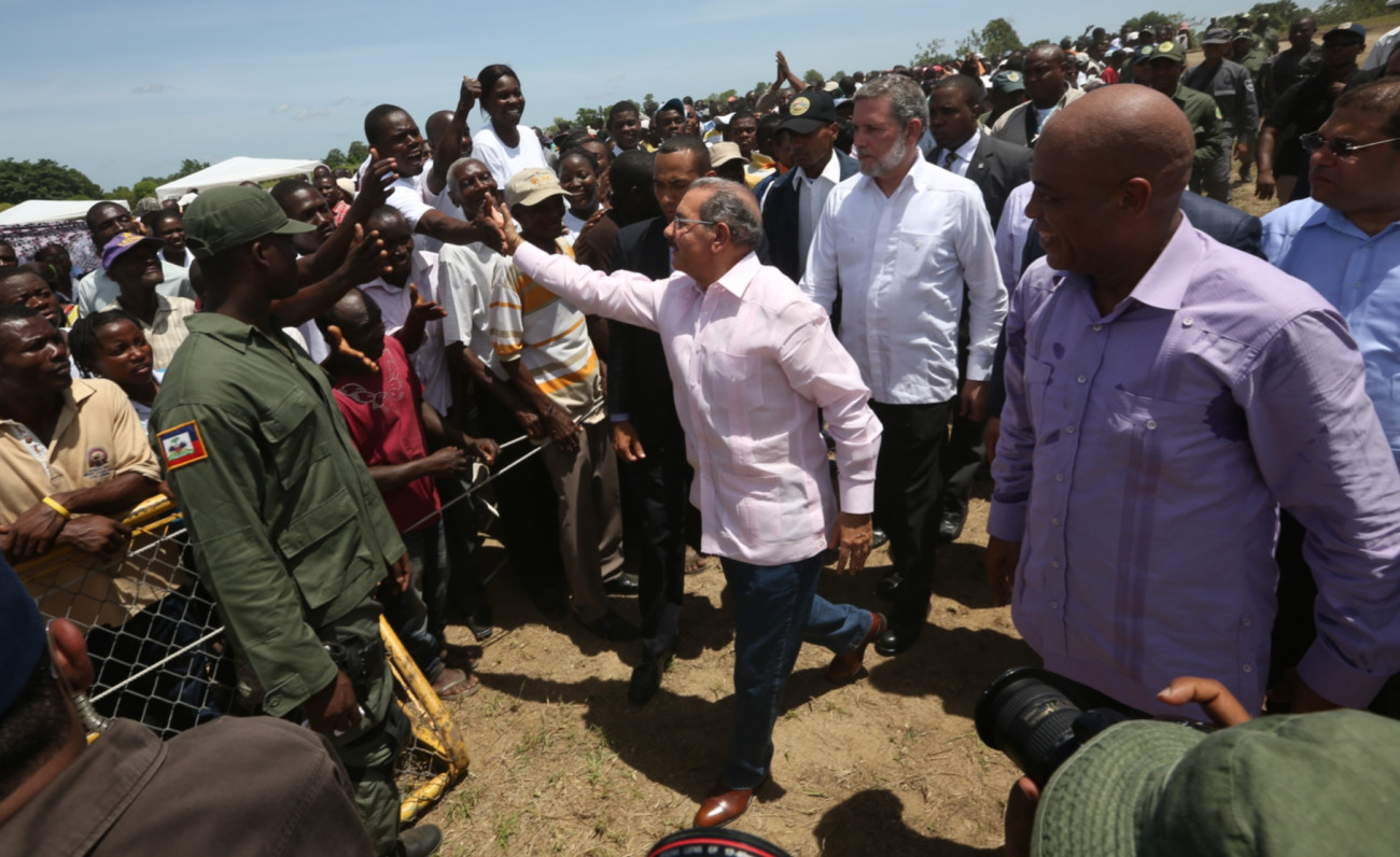 El presidente de la República, Danilo Medina, camina junto a su homólogo de Haiti, Michel Martelly, y saludan moradores de la zona al llegar a esta nación vecina, para participar en las actividades programadas por el Día Mundial del Medio Ambiente.