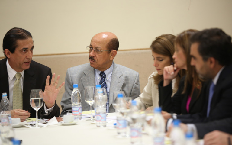 El ministro de la Presidencia, Gustavo Montalvo, junto al ministro de Economía, Planificación y Desarrollo, Temístocles Montás, y señora Ligia Bonetti, entre otros, durante la reunión de trabajo, realizada en el Palacio Presidencia.