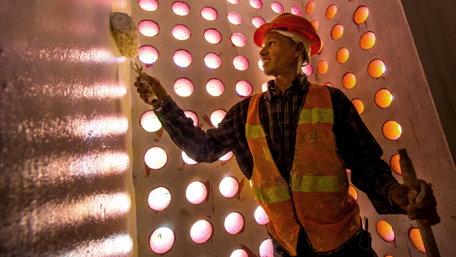 Juan pintando las paredes interiores de uno de los 1,600 apartamentos que allí se construyen para el Proyecto Habitacional La Nueva Barquita.