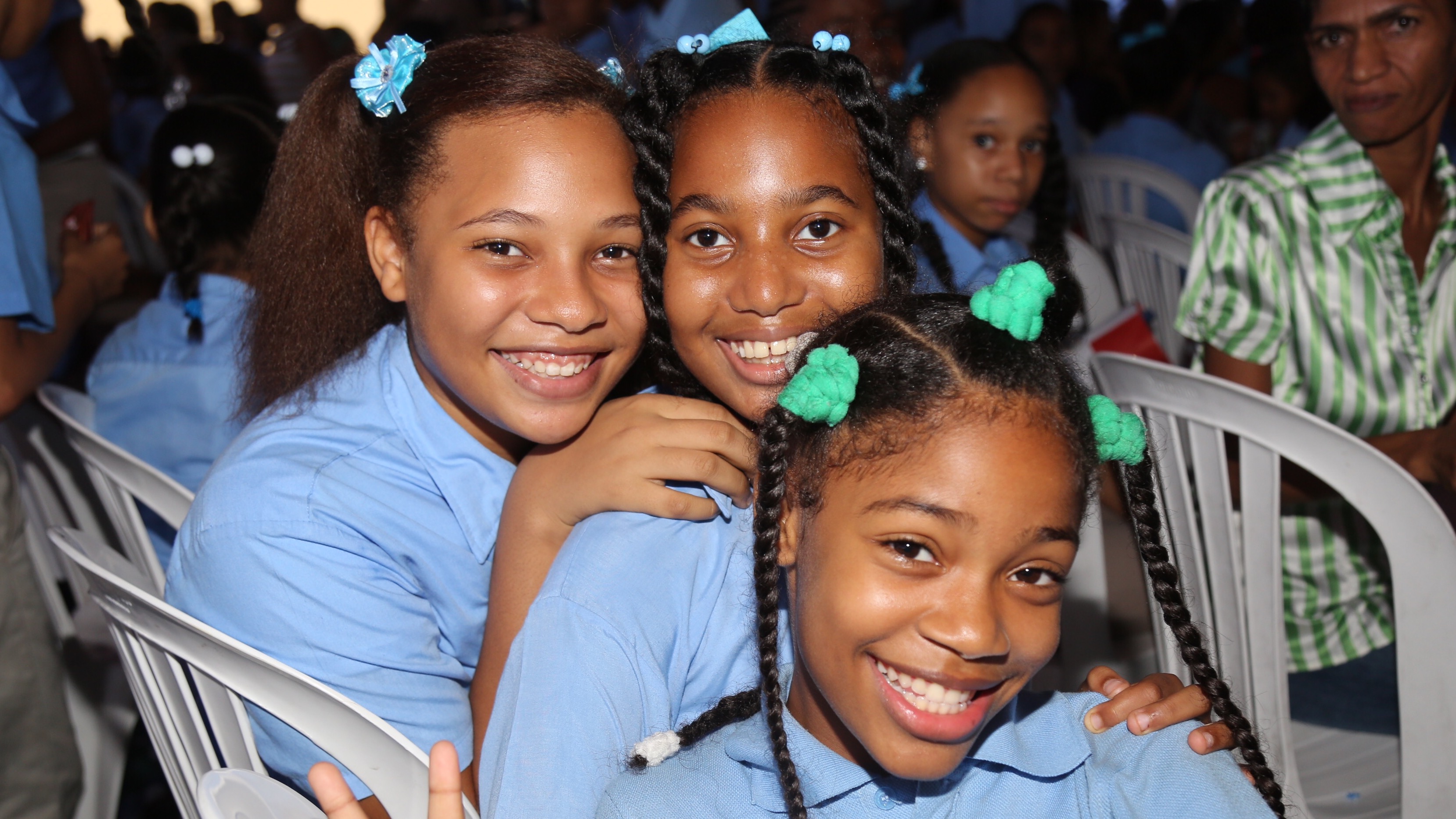 Niños y niñas de El Libertador de Herrera, con la alegría reflejada en sus rostros, celebran porque recibieron del presidente Danilo Medina la Escuela Básica Eugenio María de Hostos, en la que en lo adelante tendrán la oportunidad de recibir una educación integral y de calidad, así como alimentos nutritivos y balanceados, lo que les permitirá construir un mejor futuro.