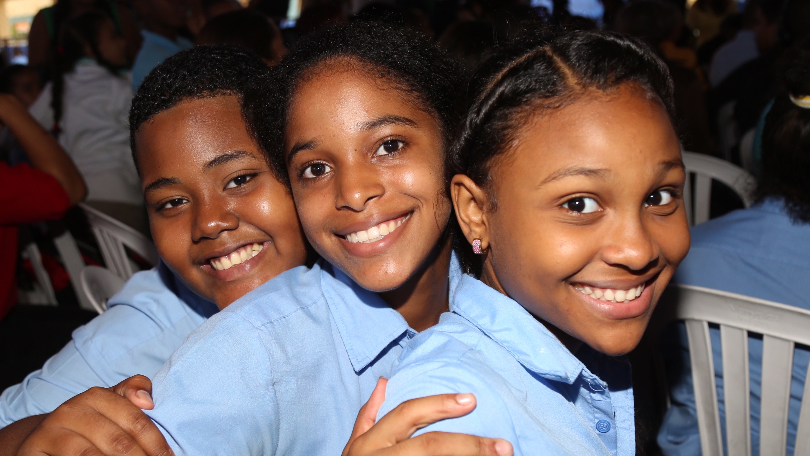 Niños y niñas de El Libertador de Herrera, con la alegría reflejada en sus rostros, celebran porque recibieron del presidente Danilo Medina la Escuela Básica Eugenio María de Hostos, en la que en lo adelante tendrán la oportunidad de recibir una educación integral y de calidad, así como alimentos nutritivos y balanceados, lo que les permitirá construir un mejor futuro.