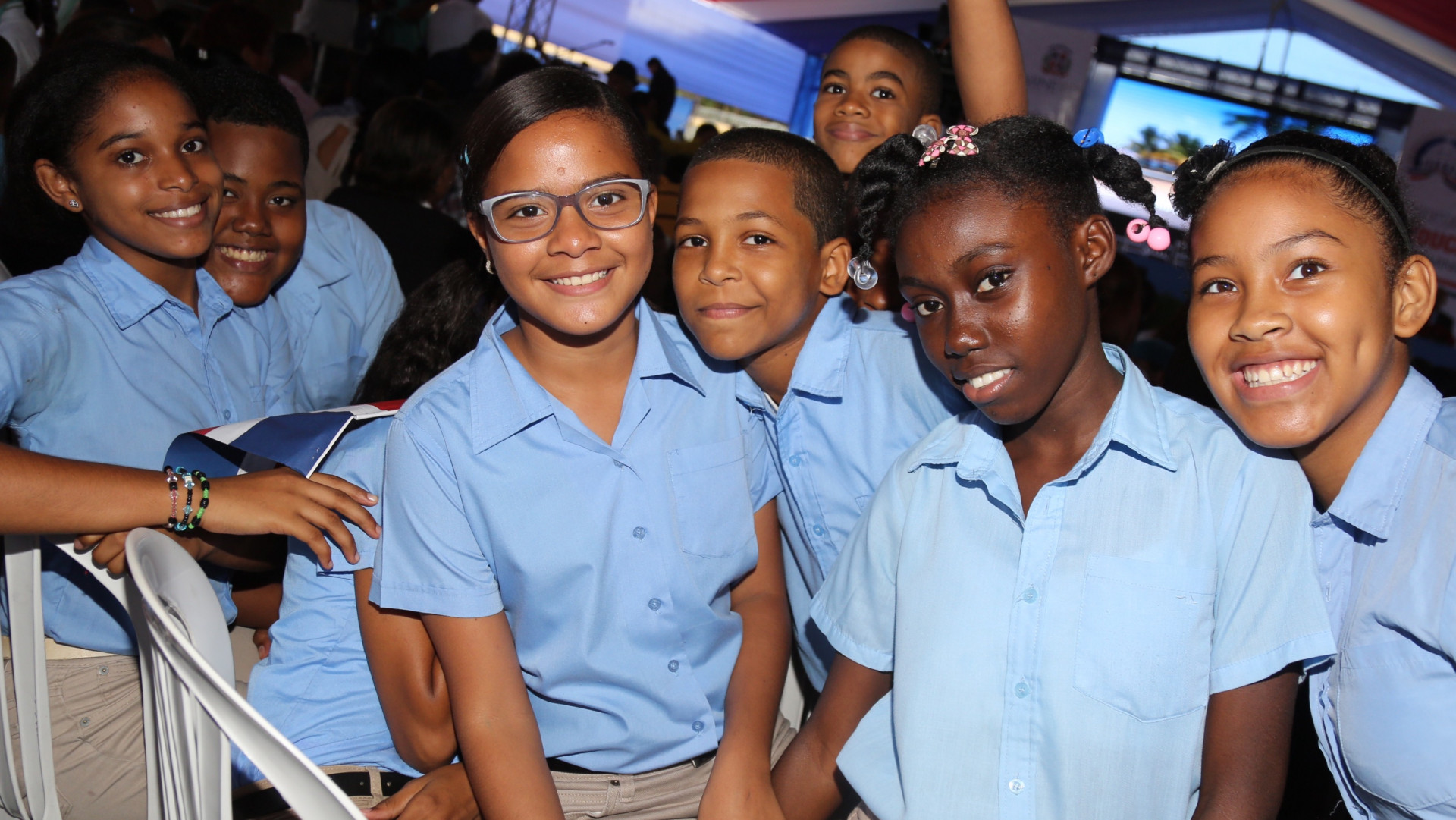 Niños y niñas de El Libertador de Herrera, con la alegría reflejada en sus rostros, celebran porque recibieron del presidente Danilo Medina la Escuela Básica Eugenio María de Hostos, en la que en lo adelante tendrán la oportunidad de recibir una educación integral y de calidad, así como alimentos nutritivos y balanceados, lo que les permitirá construir un mejor futuro.