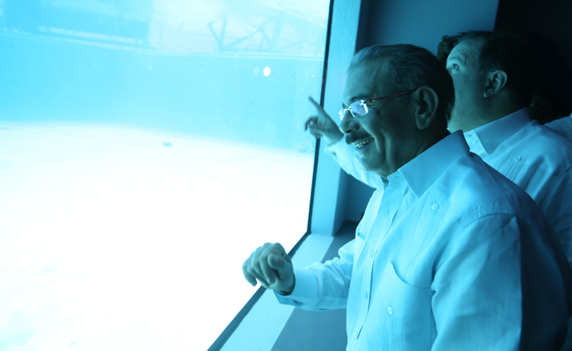 El presidente Danilo Medina al observar el impresionante tanque de agua donde serán rodadas escenas de películas en alta mar y a profundidades marinas. www.presidencia.gob.do/comunicados/danilo-medina-producto...