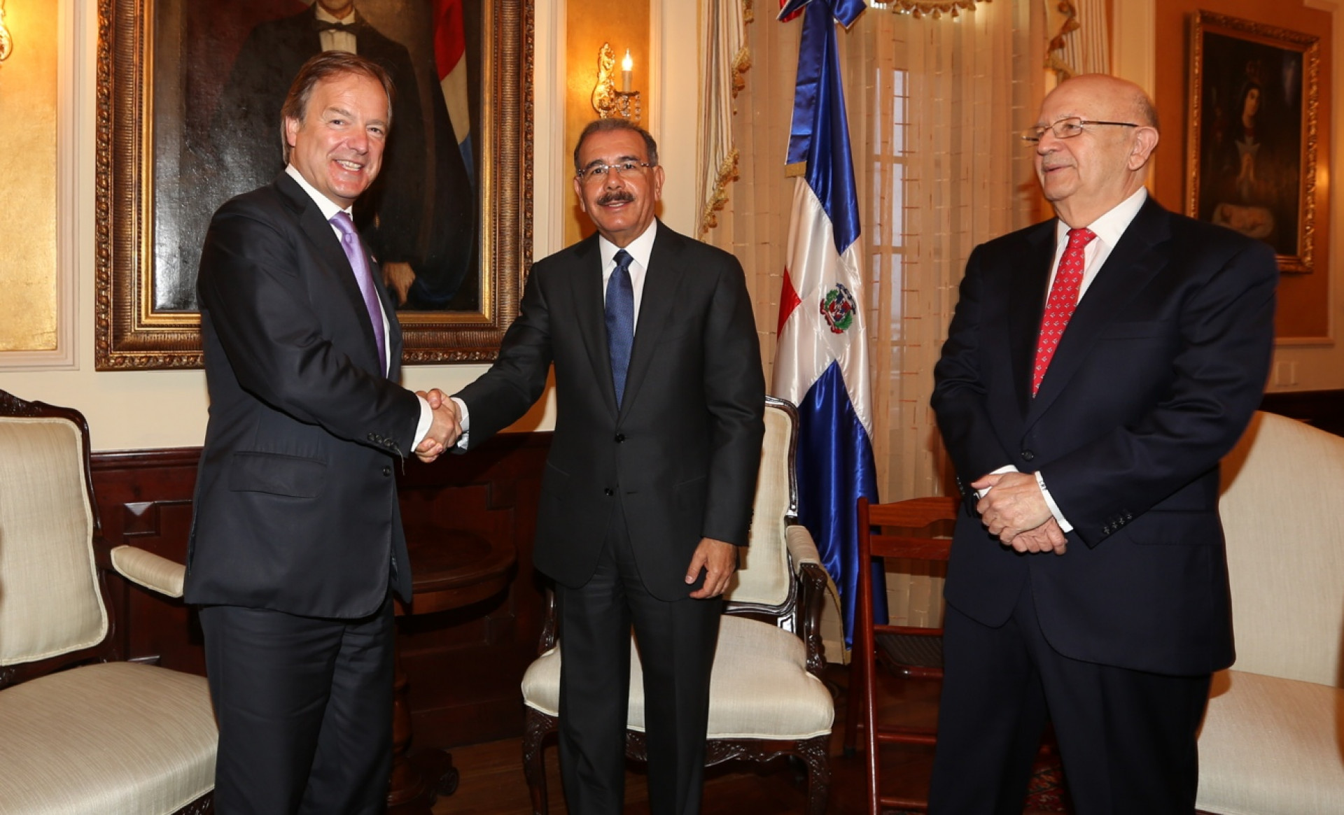 Visita del señor Hugo Swire, ministro de Relaciones Exteriores de Gran Bretaña para América Latina y el Caribe; al presidente de la República, Danilo Medina, en su despacho del Palacio Presidencial. Figura ademas, el ministro de Relaciones Exteriores, Carlos Morales Troncoso, quien lo presenta al Mandatario.