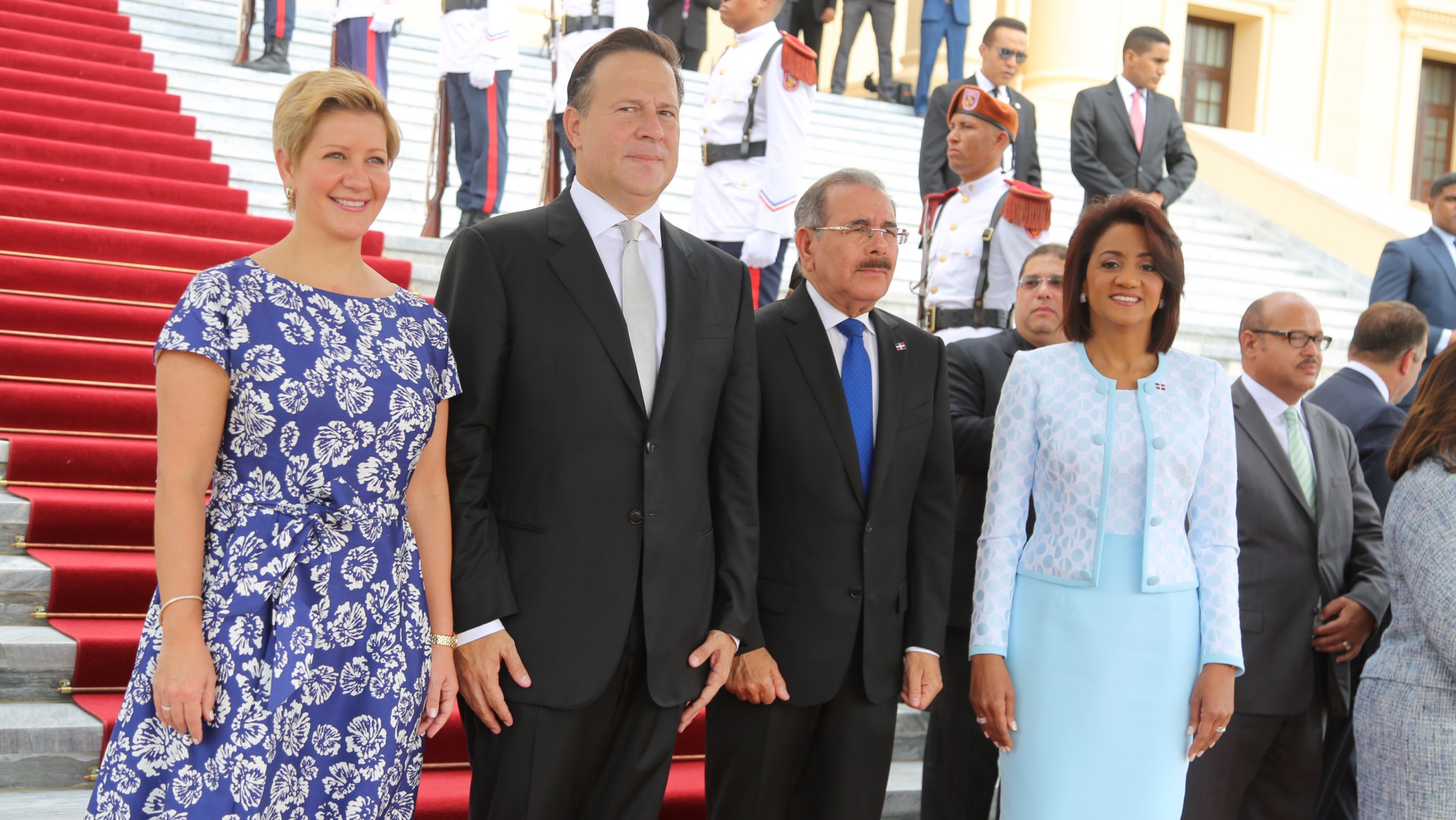 Presidente Danilo Medina acompañado de su homólogo Juan Carlos Varela y las primeras damas, Cándida Montilla de Medina y Lorena Castillo de Varela, durante ceremonial oficial en el Palacio Nacional.