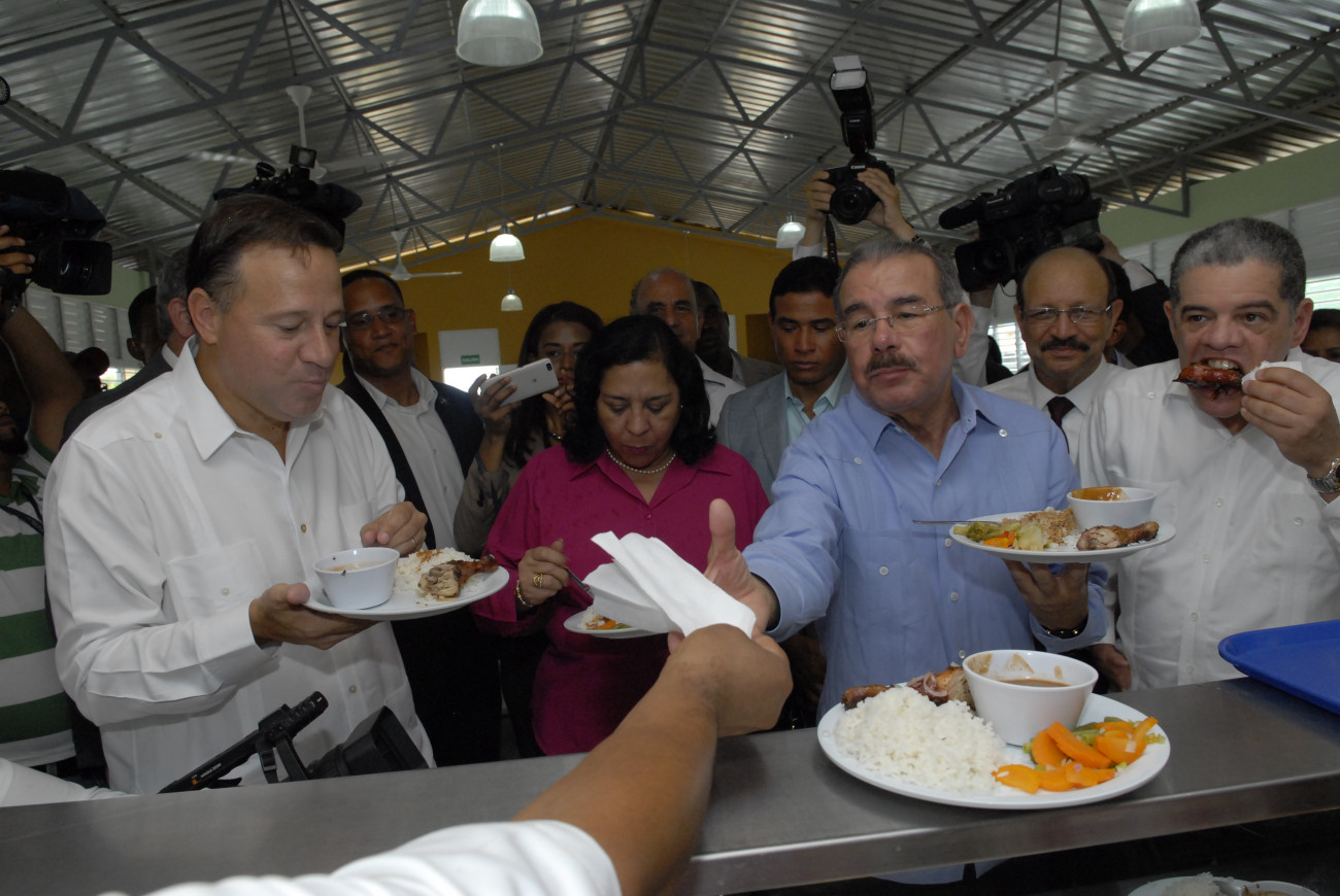 Los presidentes Danilo Medina y Juan Carlos Varela recorrieron las instalaciones de la Escuela Padre Eulalio Arias, aprovechando para probar el almuerzo que se servía hoy, como parte de la Jornada Escolar Extendida.