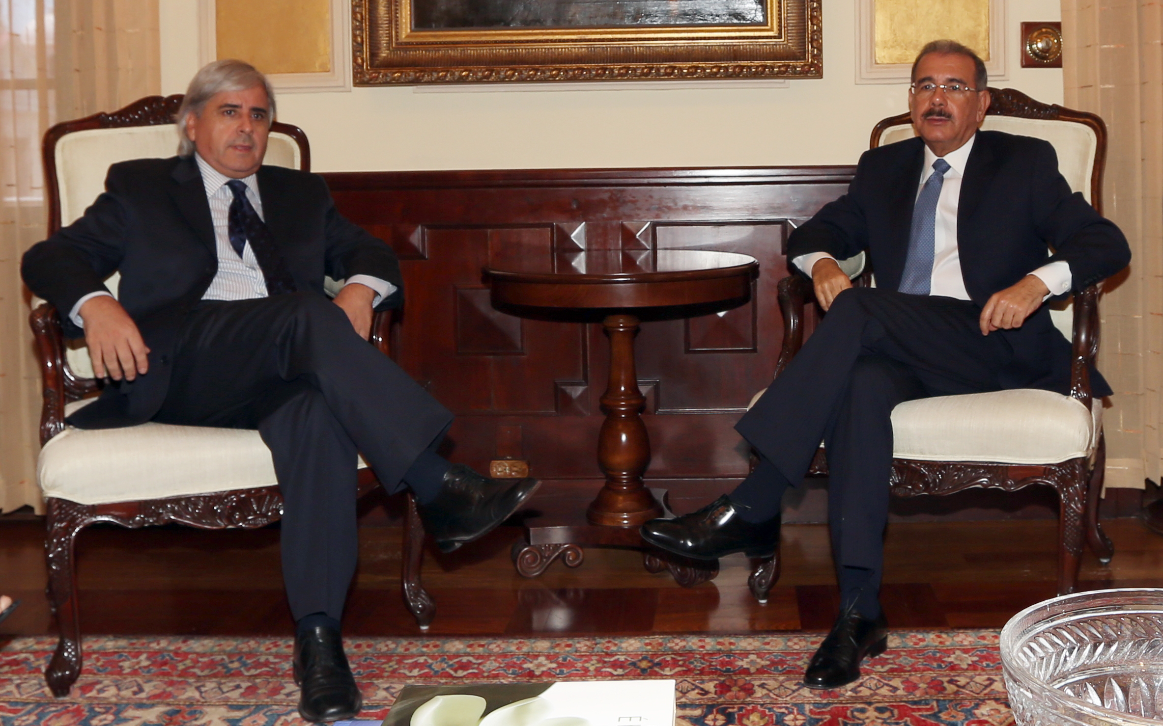 El presidente Danilo Medina y Emmanuel Enrique Hinojosa Muñoz, embajador saliente de Chile, acreditado en el país, durante reunión en el Palacio Nacional.