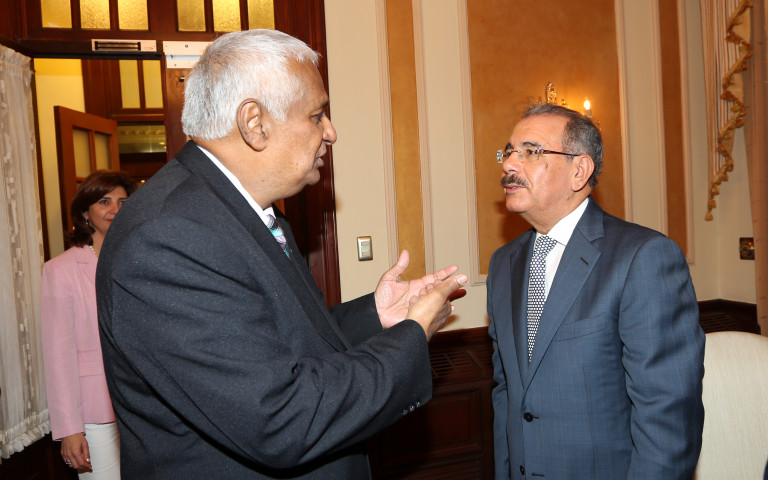 El presidente de la República, Danilo Medina, junto al canciller de Trinidad y Tobago, Winston Dookeran, durante su visita al Palacio Nacional.