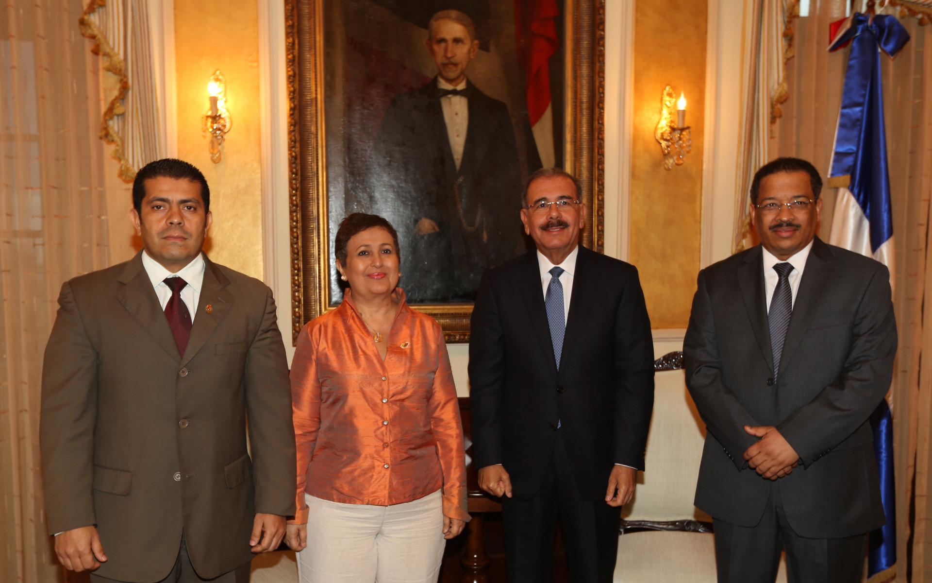 El presidente de la República, Danilo Medina, junto a Roberto Rosario,Tibisay Lucena Ramírez y Alberto Castelar, embajador de Venezuela, durante su encuentro en el despacho del Palacio Presidencial.