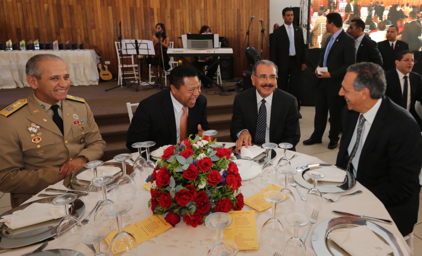 El presidente Danilo Medina compartió animadamente con Ramón Rodríguez, administrador de los Comedores Económicos, el ministro de las Fuerzas Armadas, Almirante Sigfrido Pared Pérez;y el ministro Administrativo de la Presidencia, José Ramón Peralta, durante la actividad.