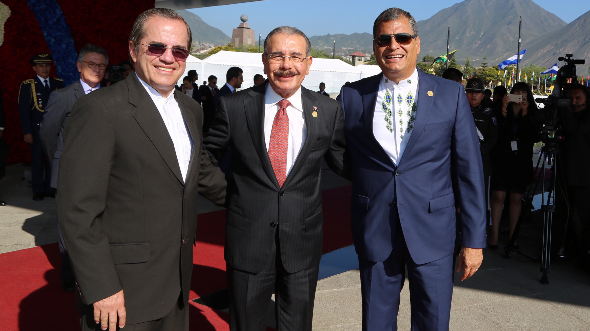 Presidente de la República, Danilo Medina Sánchez junto a su homólogo, Rafael Correa, quien asistió a recibirlo a su llegada a la ceremonia de apertura de la IV Cumbre de Estados Americanos y Caribeños (CELAC), en Ecuador, que se celebra en el Salón de Presidentes Simón Bolívar, del Edificio de Unasur, en Quito (Pichincha).