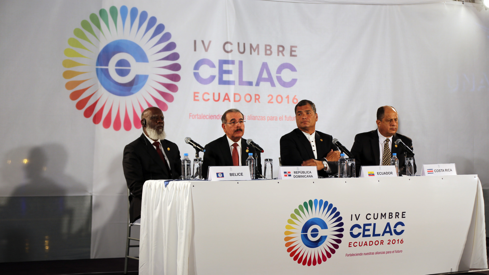 Declaración conjunta de prensa tras la culminación de la IV Cumbre CELAC, encabezada por el presidente de Ecuador, Rafael Correa, como país anfitrión del evento, junto a los presidentes, de República Dominicana, Danilo Medina Sánchez; de Costa Rica, Luis Guillermo Solís; y el ministro de Asuntos Exteriores de Belice, Wilfred Elrington. 27 de enero de 2016.